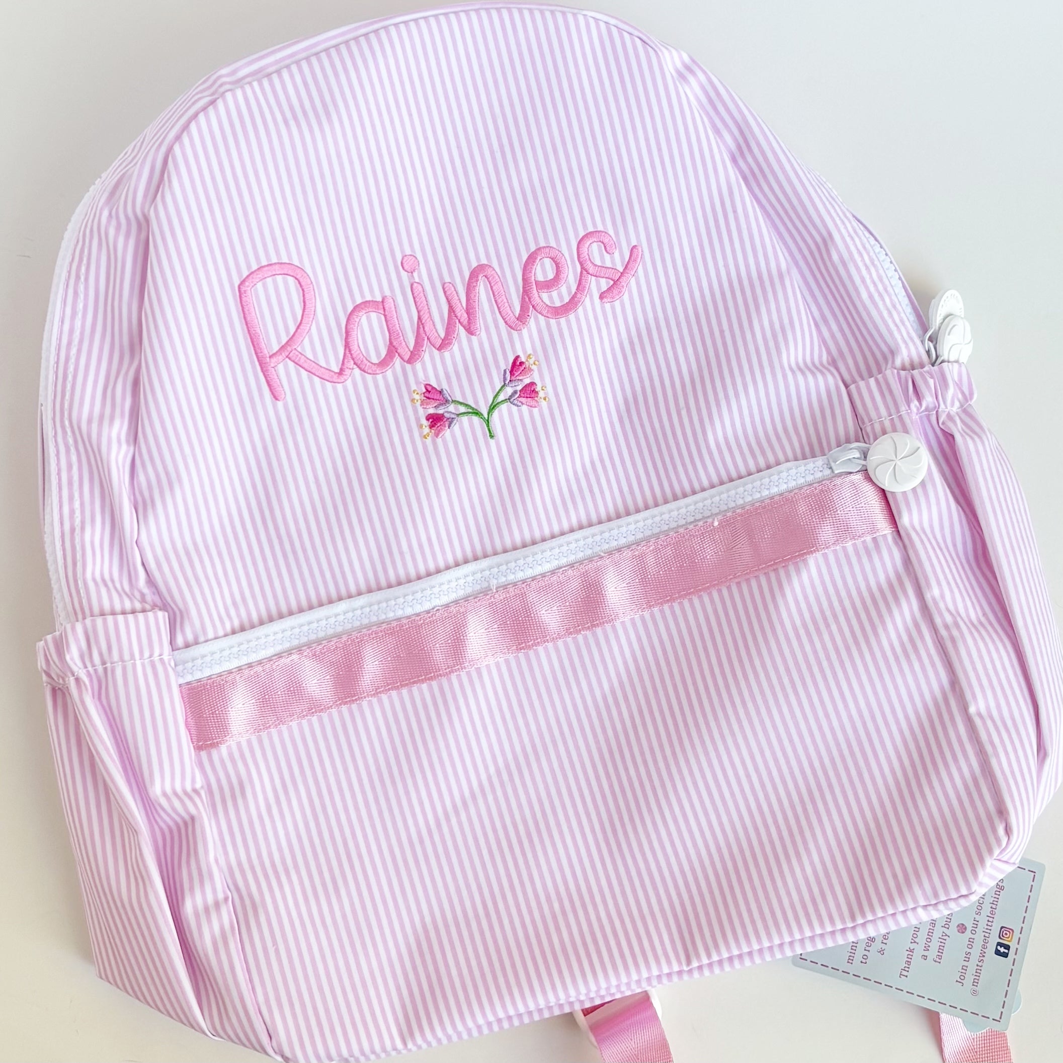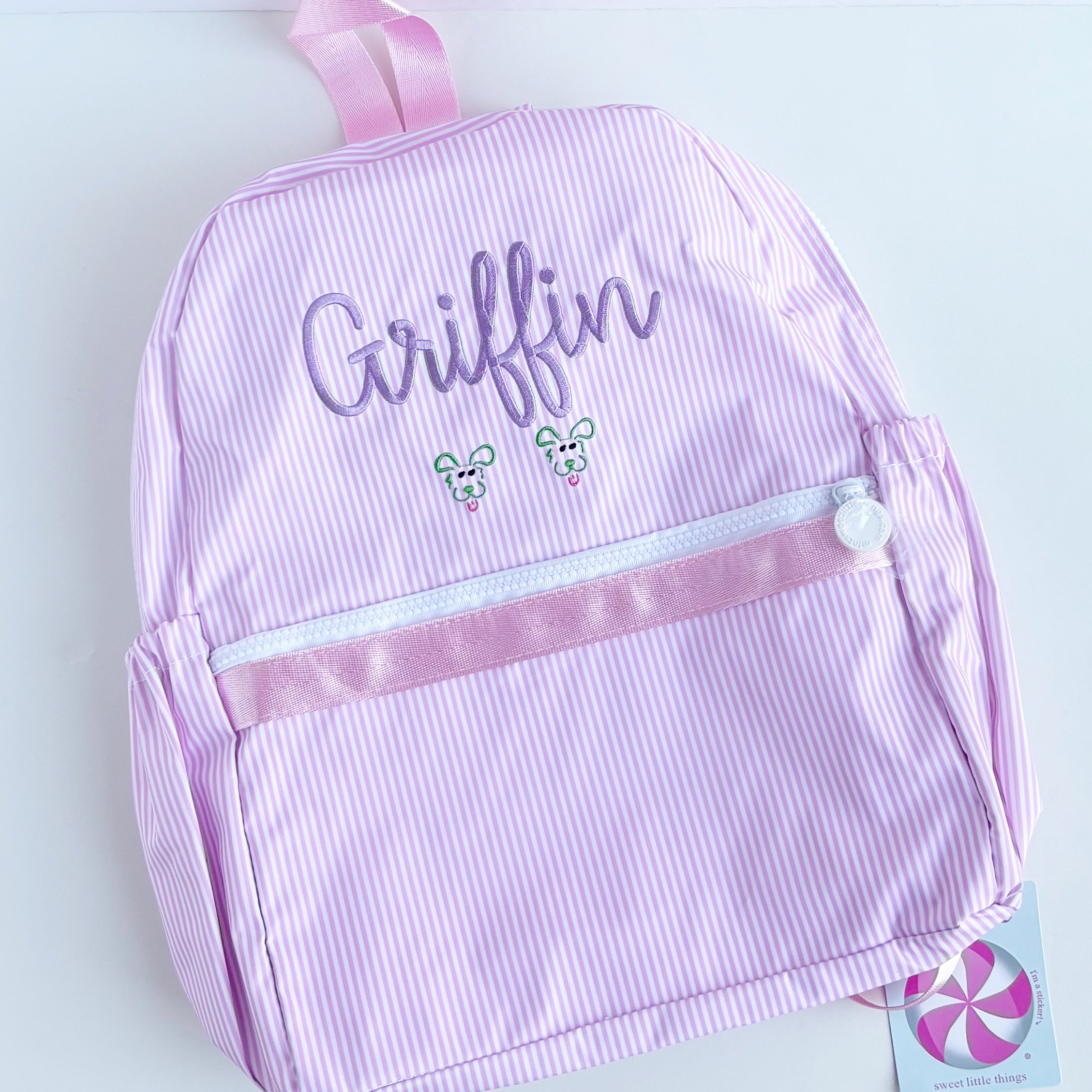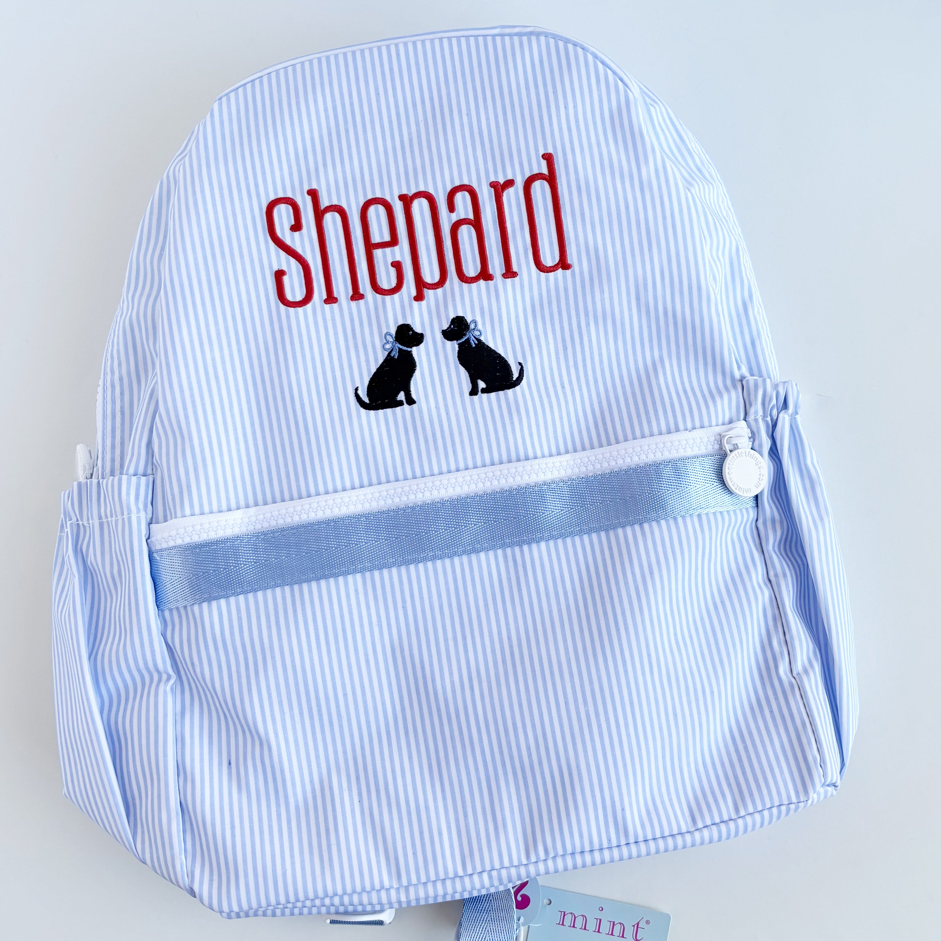NEW, GLOSSY Medium Backpacks, by Mint Sweet Little Things, are wipeable for an easy clean! Equipped with all new zippers and peppermint pulls, they also come with bottle holders on the sides. A larger backpack with room for books and folders - and a matching lunch box, of course. Kids as young as 3 can handle this bag if they are required to carry a folder from school to home each day, but it will fit kids all the way up to tween size. Makes a great diaper bag, too!