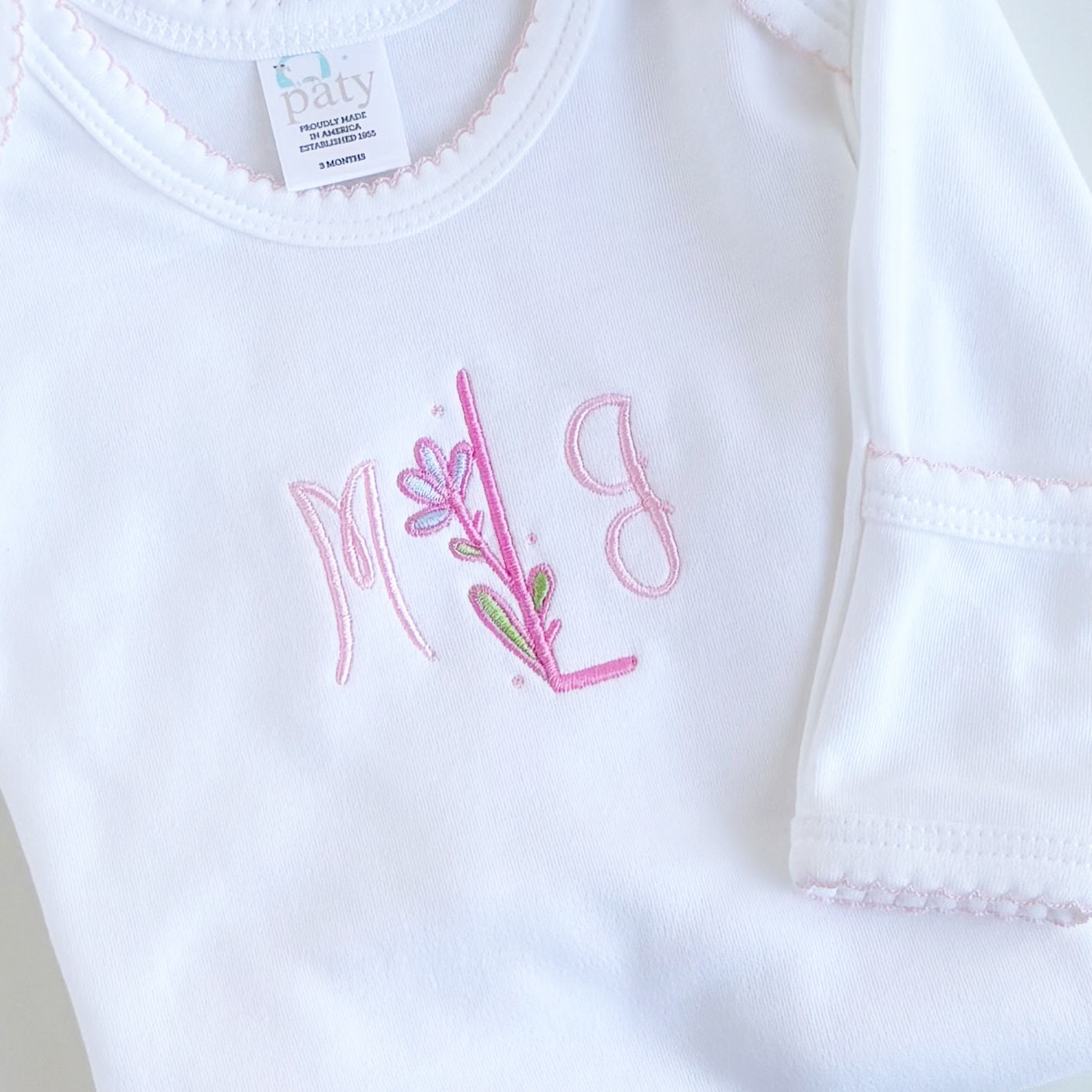 White pima cotton long sleeve gown with white, pink, or blue trim. Also available in pink with white trim and blue with white trim. (Size Newborn)