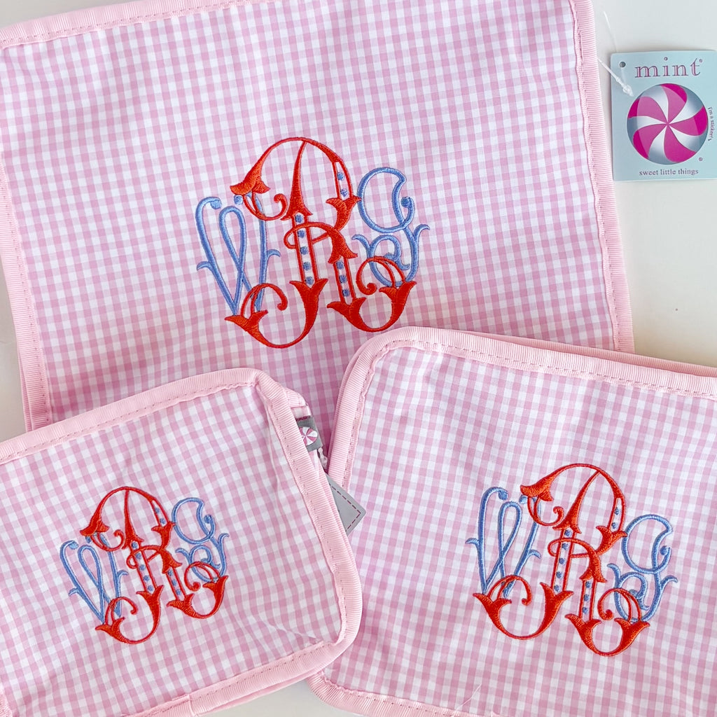 We LOVE these stacking sets! They are the ultimate organization and travel accessory! They will keep your suitcase organized for your grown up weekend away. New parents can keep diapers, wipes, and toys easily accessible in your diaper bag! College girls get ready! They are perfect for clothing items, makeup, brushes, etc! Add your monogram to your set to really make it POP! Available in navy, baby blue, pink, white, lilac, and Sweet Pea seersuckers; pink, baby blue, and lilac ginghams.